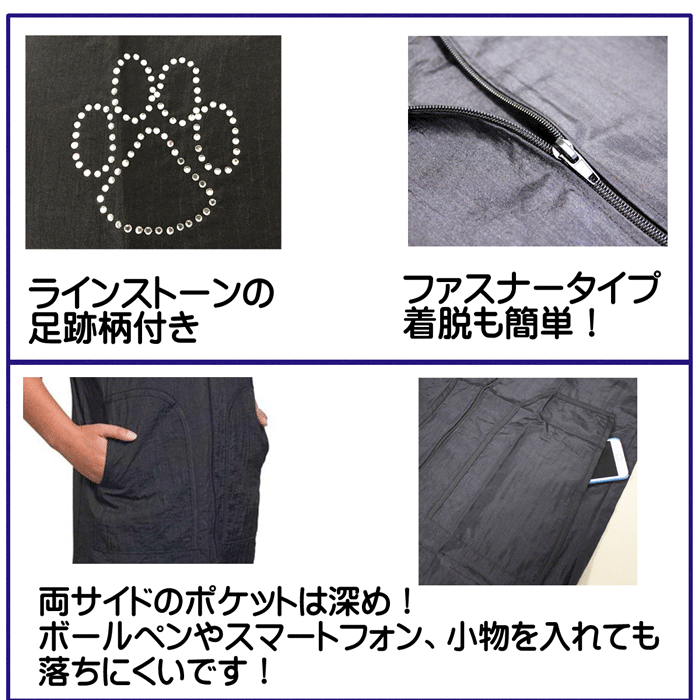 ナイロン素材のため、軽量で動きやすいです。 また、カットした被毛やほこり等が服に付きにくい生地で、生地には撥水加工が施されています。